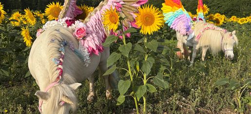 Cinders is one of our rescues, she came to us in 2021 with her foal Princess. Since then she has come along wonders and is now enjoying her new career as a unicorn. She has a slight golden tinge to her coat, which makes her especially rare!